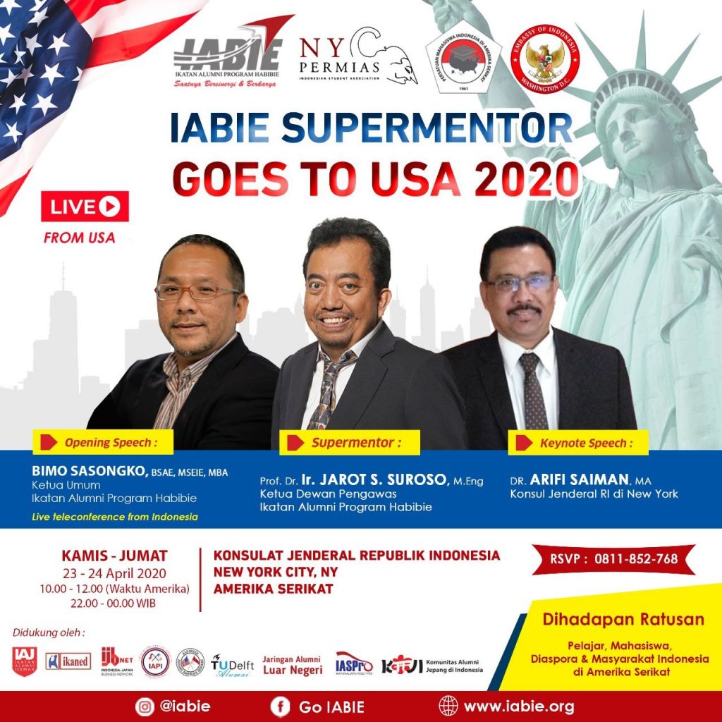 Supermentor: Menyiapkan SDM Unggul menghadapi Era Revolusi Industri 4.0. Kuliah Umum untuk Pelajar/Mahasiswa, Keluarga dan Masyarakat Indonesia se Kota New York USA pada tanggal 23-24 April 2020 di Konsulat Jenderal Republik Indonesia di New York USA.
